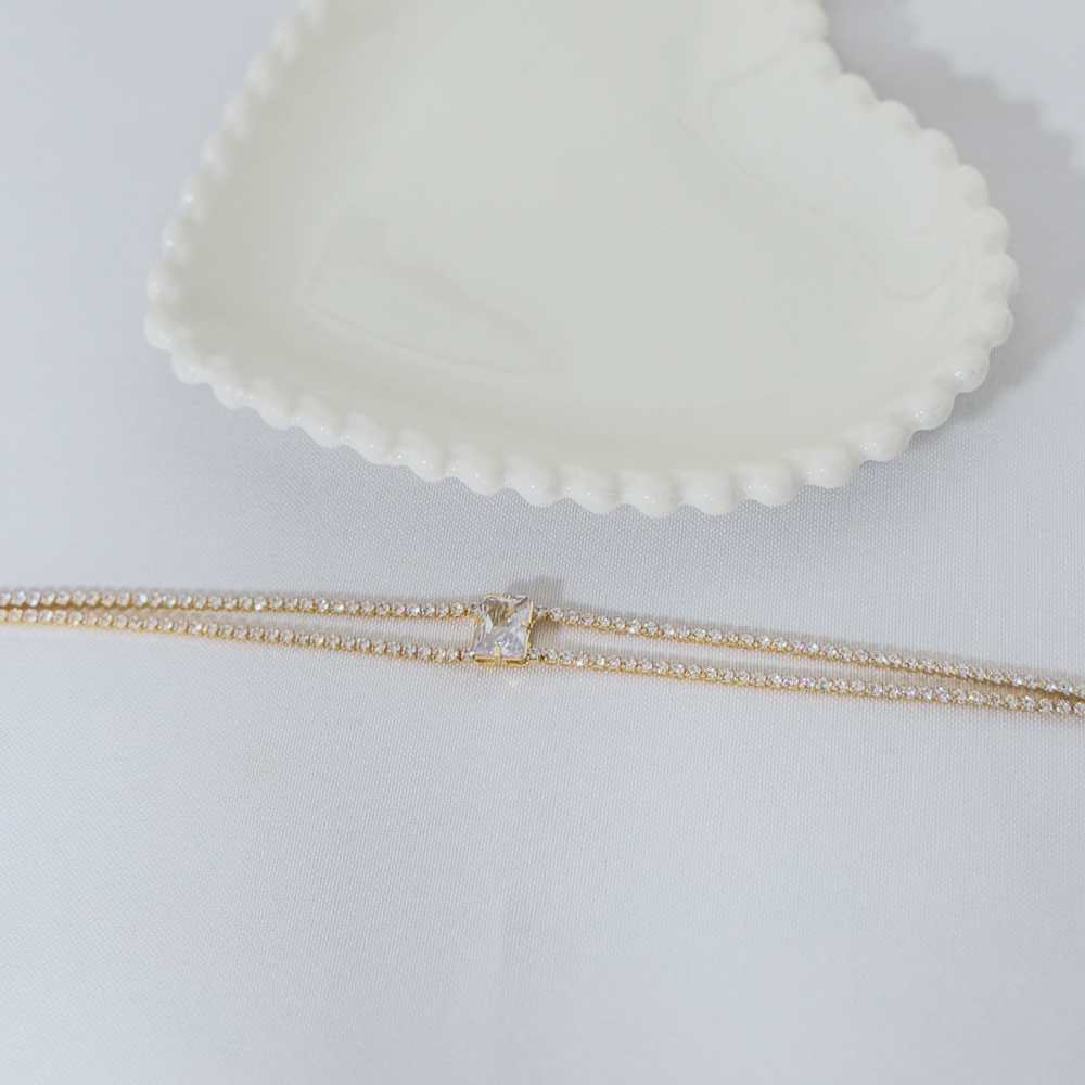 Choker com dupla corrente, pedra de zircônia cristal. Tamanho 35 cm + extensor.