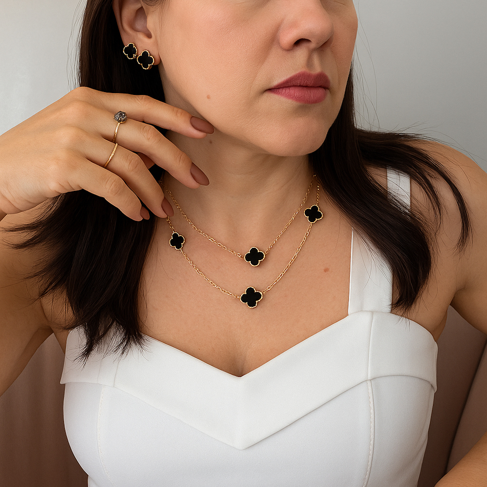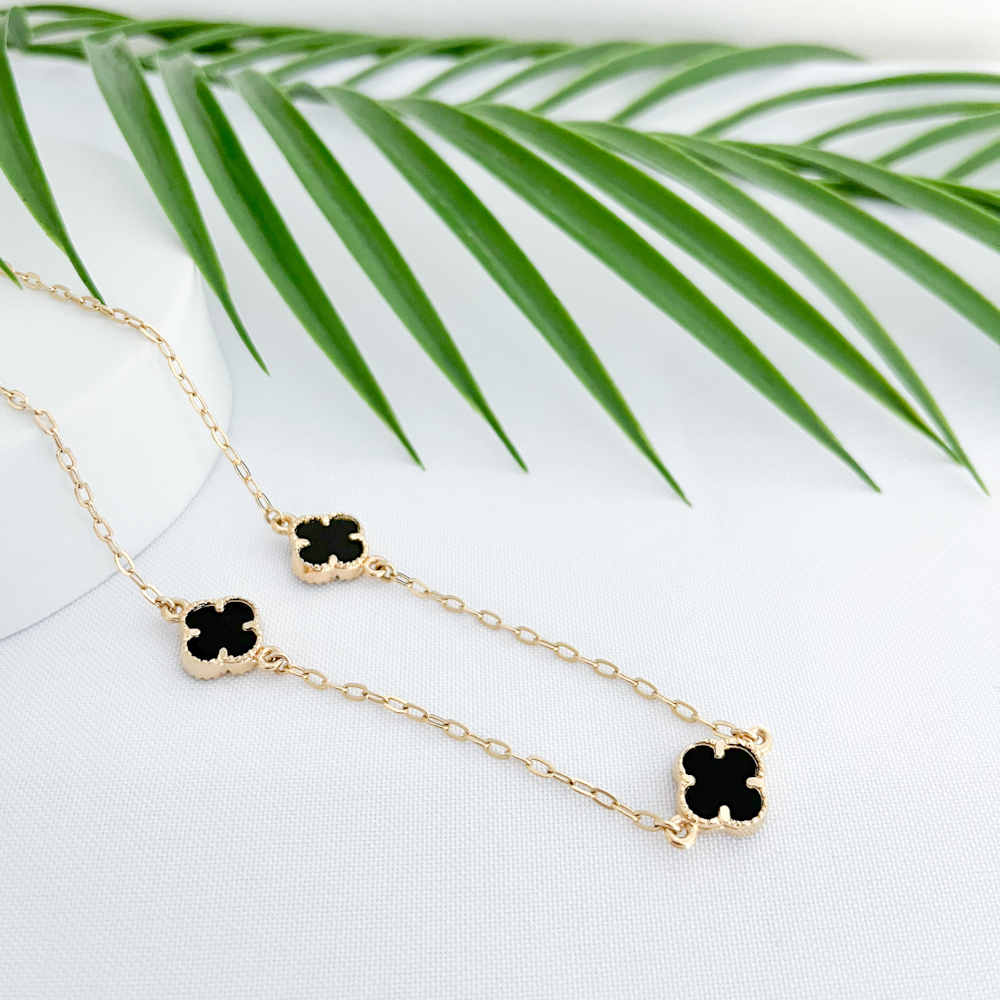 Colar Dourado Com 3 Trevos em Resina Preta modelo Van Cleef ,Tamanho 45cm com Extensor.