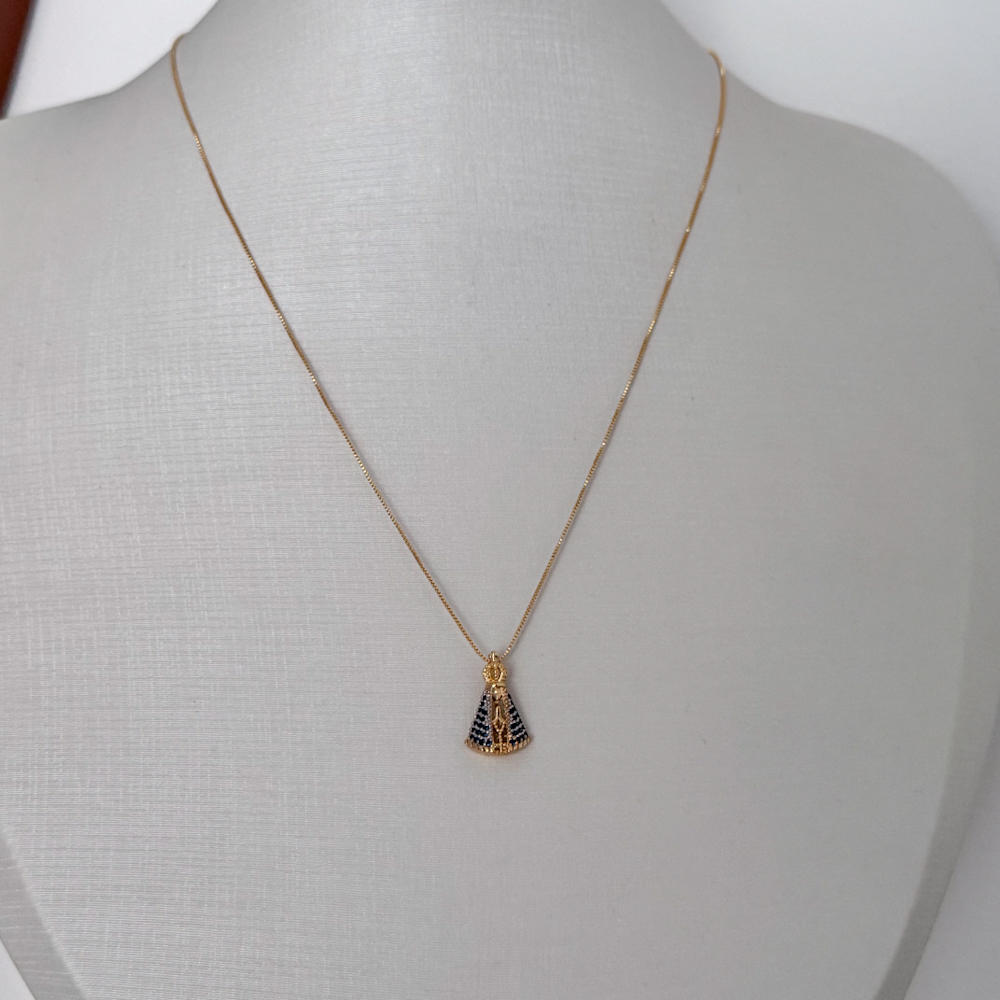 Colar 45cm com Pingente de Nossa Senhora Aparecida em zircônias No Manto azul de 1,8cm.