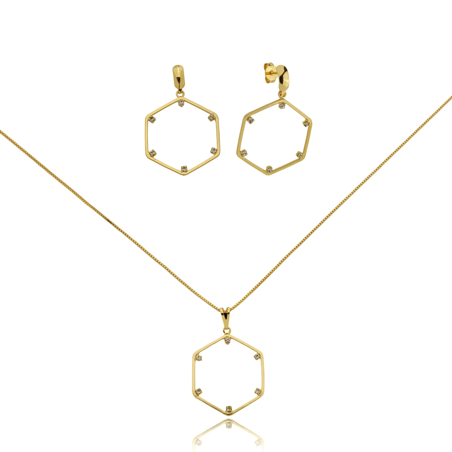 Conjunto adulto com corrente veneziana 45 cm, brinco e pingente no formato de hexágono de 1,7 cm com cristais.